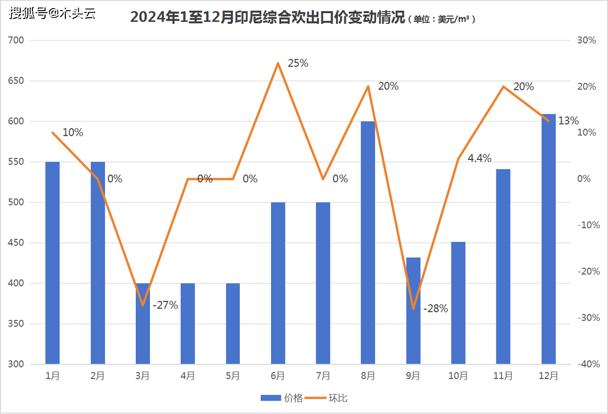 回首2024年,印尼柳桉出口价正在3月至7月履历了较长一段不变期,随后正在8月环比上涨了10%后,于11月达到全年峰值,冲破1300美元/立方米,同比增加17%,环比增加22%。及至岁尾12月,印尼柳桉出口价下调6%,估计至来岁1月价钱还存鄙人调空间。