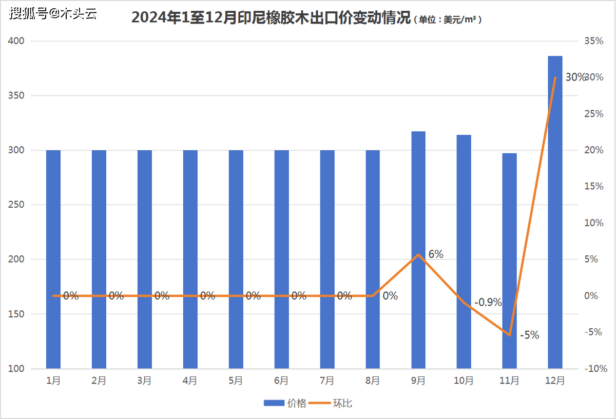 前8个月,印尼橡胶木出口价均维持正在300美元/立方的程度,9月出口价略微上调6%至317美元/立方,10月和11月持续下调,此中11月成为全年最大程度。猜测遭到泰国暴雨影响橡胶木原料供应,以及全球橡胶价钱大涨,12月马来西亚橡胶木出口价达到全年最高程度,同比增加28。6%至386美元/立法?。