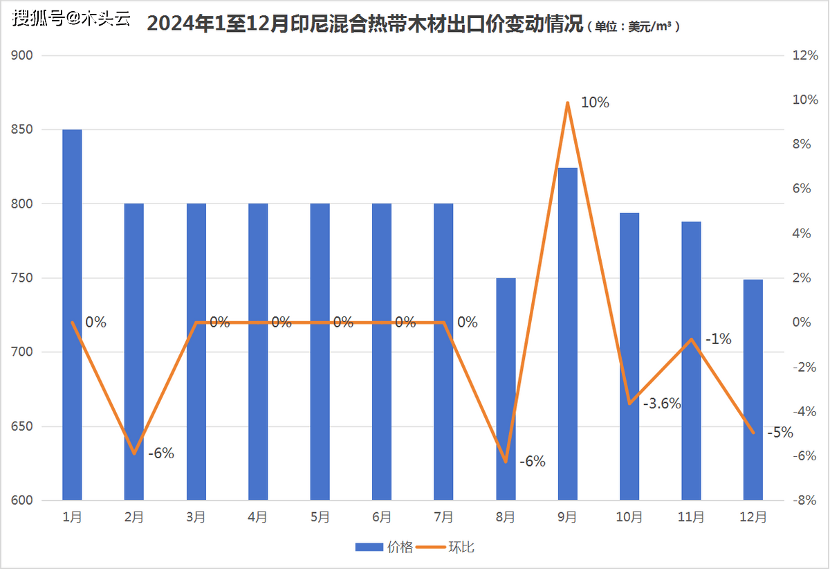印尼夹杂热带木材方面,全年出口价峰值呈现正在1月,其余月份表示较为不变,根基维持正在800美元/立方的程度。而正在8月呈现了全年最低程度,环比下降了6%;随后正在9月攀升至824美元/立方米,环比增加10%。10月至12月持续三月下跌,估计2025岁首年月价钱会有所上调。