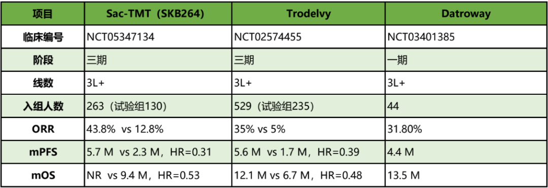 HR+/HER2-乳腺瘤约占所有乳腺癌的70%,目前仅有吉利德和第一三共的产物获批。SKB264正在此前发布的I期临床试验数据中,总体响应率为36。8%,疾病节制率(DCR)为89。5%。报道的中位无进展期(PFS)为11。1个月,优于曾经获批的Trodelvy的5。5个月,显示正在这一沉度医治过的患者人群中具有相当的疗效。此外正在最主要的顺应症非小细胞肺癌中,目前还没有一款TROP-2 ADC药物获批上市,吉利德的III期临床曾经失败,第一三共基于亚组阐发递交了上市申请。成果上看,SKB264正在EGFR突变的二线及以上晚期NSCLC顺应症中取得ORR为60%的优异疗效数据,中位PFS达到11。1个月,这一数据不只正在TROP-2 ADC范畴具有合作力,同时相较于康方的PD-1/VEGF双抗AK112仍具有必然的合作力,将来值得等候。